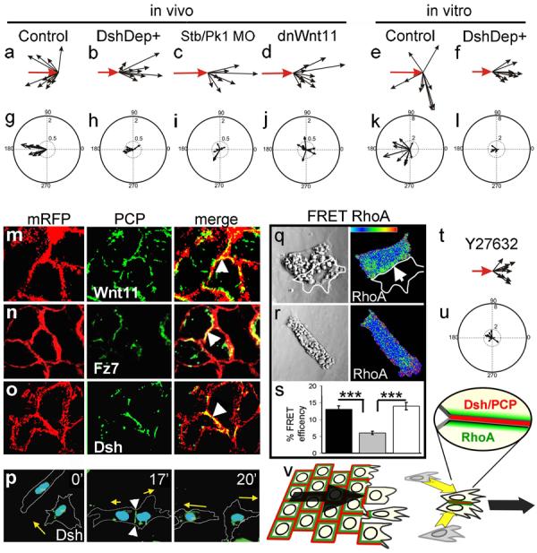 Figure 4. Contact Inhibition of Locomotion: requirement of PCP and RhoA activitiesCell collisions were analysed in vivo (a-d, g-j) and in vitro (e, f, k, l). Velocities (a-f) and accelerations (g-l) were measured after the indicated treatments. Scale is the same for all panels. The change of velocity is significantly and clustered in the controls (p<0.005, n=10). No significant change is observed in any of the PCP treatments (p>>0.05, n=10 for all cases) (m-p). Different PCP components are localised at the cell-cell contact (arrowheads). mRFP: membrane-RFP; (m) Wnt11-YFP. (n) Fz7-YFP. (o) Dsh-GFP. (p) Cells expressing Dsh-GFP were analysed during a cell collision. The outline of the cell is taken from the DIC images, time in minutes; arrow: direction of migration; arrowhead: cell contact showing Dsh localization. (q-u) Role of RhoA. (q-s) FRET analysis of RhoA activity. (q) Two NC cells in contact showing RhoA activity localised at the cell contact (arrow). (r) Single NC cell. (s) RhoA FRET efficiency. Black bar: cells in contact; grey bar: single cell; white bar: single cell in which PCP has been activated by expression of DshΔN. ***: p<0.005; n= 12 each condition. (t, u) Cell collisions were analysed in the presence of the Rock inhibitor Y27632. (t) Velocity vectors; (u) acceleration vectors. No significant change in the velocity (p>>0.05, n=10) (v) Contact Inhibition of Locomotion is controlled by localization of PCP elements (red) and RhoA activity (green) at the cell contact leading to directional migration (arrows).