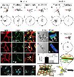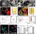 Figure 3. Effect of PCP signalling on cell contacts(a-c). SEM of Xenopus cultured NC expressing DshDep+. Red square indicates leading cells. Higher magnification views of other leading cells are shown in b and c. Arrowheads: cell protrusions; arrow: direction of migration. Bars: 25μm in b, 50μm in c. (d, e) Two-Plane Confocal image to show cell protrusions (red) and cell shape (green). Cell protrusions are produced only at the border of the control explant (d), while they are observed between the DshDep+ cells (arrows in e). (d', e') Schematic representation of d and e. (f-i) Analysis of tracks of migrating NC cells. Blue: leading cells; red: trailing cells. Tracks of control (f) or DshDep+ (g) cells. Distribution of angles of migration for leading (blue) and trailing (red) control (h) or DshDep+ (i) cells versus the distance from the origin. (j-m) Analysis of migration of dissociated NC cells. (j, k) Five frames taken every 10 min were overlapped for a control cell (j) and a DshDep+ cell (k). Numbers: consecutive position of the cell. Blue line: track. Persistence (l) and Speed (m) were calculated for control (white bar) and DshDep+ (grey bar) cells. (p<0.05; n= 62).