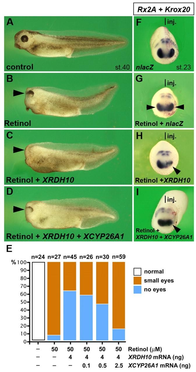 Fig. 6. XRDH10 co-operates with retinol during head development. (A-D) Embryos were injected into the animal pole at the four-cell stage with the indicated mRNAs and treated with DMSO or retinol at stages 9-12. (A) DMSO-treated control embryo at tadpole stage. (B) Retinol (50 µM) induces microcephaly at the tadpole stage. (C) Injection of XRDH10 mRNA (1 ng into four blastomeres) and subsequent retinol treatment causes anencephaly. (D) XCYP26A1 mRNA (2.5 ng) partially restores eye and head structures in retinol and XRDH10-treated embryos. (E) Eye deficiencies induced by retinol and XRDH10, and dose-dependent rescue by XCYP26A1 mRNA in stage 40 embryos. (F) Control embryo at the tail bud stage after single injection of nlacZ mRNA. (G) Retinol (25 µM) leads to a slight reduction of the Rx2A-positive eye field (arrowheads). (H,I) In the retinol-treated embryos, XRDH10 mRNA (1 ng in one dorsal blastomere) causes a unilateral collapse of Rx2A expression (arrowhead in H), which is rescued by the co-injection of 2.5 ng XCYP26A1 mRNA (arrowhead in I). The indicated phenotypes were observed in: A, 24/24; B, 25/27; C, 28/45; D, 51/59; G, 13/15; H, 20/35; I, 10/13 embryos. |