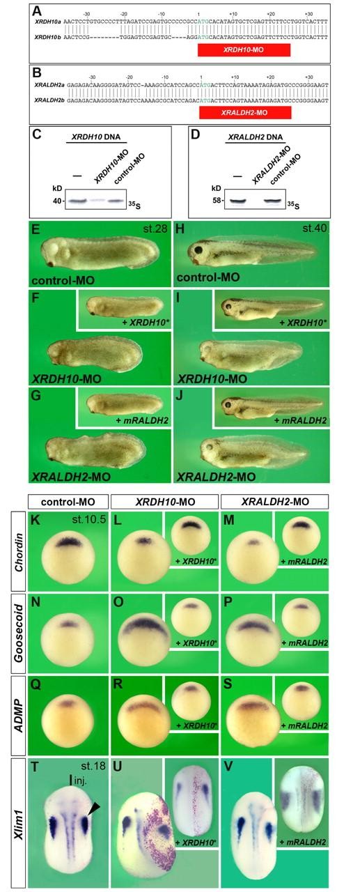 Fig. 7. Knockdown of XRDH10 and XRALDH2 induces ventralization and influences mesodermal gene expression. Antisense morpholino oligonucleotides (MOs) were injected marginally at the two-cell stage (5.2 pmol per blastomere), followed by injection of non-targeted mRNA constructs (XRDH10* and mRALDH2) at the four-cell stage (1 ng per blastomere). (A,B) MOs target the translation initiation sites of two pseudoalleles of Xenopus laevis RDH10 and RALDH2. (C,D) Protein synthesis of XRDH10 and XRALDH2 is specifically inhibited by XRDH10-MO and XRALDH2-MO, but not by control-MO of random sequence. (E-J) Microinjection of XRDH10-MO and XRALDH2-MO leads to microcephaly and enlarged ventroposterior structures in tailbud embryos (E-G), and to reduced eye structures and shortened tails in tadpoles (H-J). Normal development is restored by XRDH10* and mRALDH2 mRNAs, respectively (insets). (K-S) Gastrula embryos in dorsal view. XRDH10- and XRALDH2-morphants have reduced Chordin expression (K-M) and expanded expression domains of Goosecoid (N-P) and ADMP (Q-S). (T-V) Neurula embryos in dorsal view (anterior to the top) after a single injection of MOs with the lineage tracer nlacZ mRNA (red nuclei). XRDH10-MO and XRALDH2-MO reduce Xlim1 expression in the pronephros (arrowhead). The indicated phenotypes were observed in: E, 101/117; F, 62/84 (inset, 73/98); G, 44/67 (inset, 80/84); H, 74/79; I, 39/50 (inset, 56/68); J, 18/48 (inset, 58/64); K, 33/33; L, 21/36 (inset, 19/27); M, 28/36 (inset, 20/28); N, 51/56; O, 28/38 (inset, 46/53); P, 37/49 (inset, 34/44); Q, 52/52; R, 14/26 (inset, 51/62); S, 51/62 (inset, 23/32); T, 11/15; U, 14/20 (inset, 28/32); V, 16/24 (inset, 50/51) embryos. |