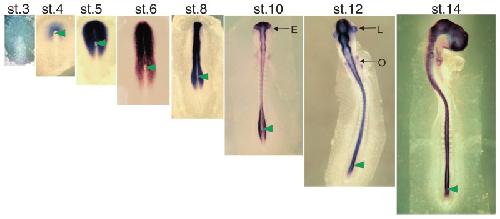 Fig. 1. Expression of Sox2 in chicken embryo at various developmental stages marking neural and sensory primordia, as indicated by in situ hybridization. Anterior is toward the top. Photographs were taken at the same scale. The position of organizer (Hensen’s node) is indicated by an arrowhead. Head ectoderm (E), lens placode (L) and otic vesicle (O) are indicated by arrows. Adapted from Fig. 1A in Uchikawa et al. (2003). Functional analysis of chicken Sox2 enhancers highlights an array of diverse regulatory elements that are conserved in mammals. Dev. Cell 4, 509–519, with permission from Elsevier.