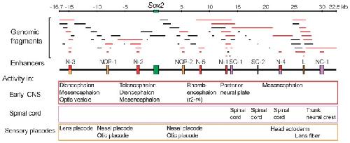 Fig. 2. Determination of Sox2 enhancers with activities in various and distinct domains of embryonic CNS and sensory placodes. Genomic fragments covering the 50 kb region of chicken Sox2 locus were individually tested for enhancer activity in electroporated chicken embryos. DNA fragments that demonstrated an enhancer activity are shown in red, and functionally determined enhancers are indicated by boxes on the map (middle). Adapted from Fig. 2 in Uchikawa et al. (2003). Functional analysis of chicken Sox2 enhancers highlights an array of diverse regulatory elements that are conserved in mammals. Dev. Cell 4, 509–519, with permission from Elsevier.