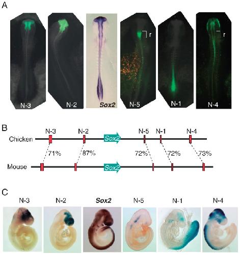 Fig. 3. Conserved activity of enhancers N-1 to N-5 between chicken and mouse. (A) Domains of the embryonic CNS where chicken enhancers N-1 to N-5 show activity in electroporated embryo compared to Sox2 expression (in situ hybridization) of stage 11 embryo. Fluorescence images (green) representing enhancer activities are overlaid on darkened bright-field images to indicate respective embryonic domains. “r” indicates the rhombencephalic domain. The orange speckles in the enhancer N-5 specimen are due to DsRed fluorescence that was derived from co-electroporated control vector and not removed completely by optical filtration. (B) Alignment of chicken and mouse Sox2 enhancers with nucleotide sequence identity expressed as a percentage. (C) Activity of mouse enhancers at E9–9.5 in transgenic mouse embryos, compared to Sox2 in situ hybridization. Transgenes for Sox2 enhancers, except for enhancer N-1, were constructed by introducing each tetrameric Sox2 enhancer of mouse upstream of the hsp68 promoter-LacZ cassette,44) and primary transgenic embryos were examined. Tetrameric N-1 enhancer in a tk-LacZ vector was used to generate transgenic lines.