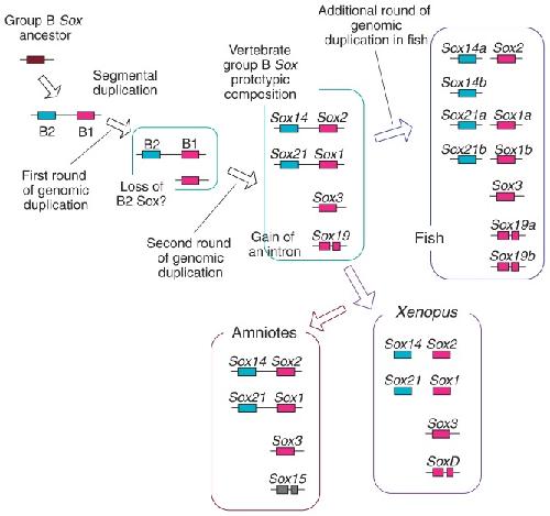 In higher vertebrates, the expression of Sox2, a group B1 Sox gene, is the hallmark of neural primordial cell state during the developmental processes from embryo to adult. Sox2 is regulated by the combined action of many enhancers with distinct spatio-temporal specificities. DNA sequences for these enhancers are conserved in a wide range of vertebrate species, corresponding to a majority of highly conserved non-coding sequences surrounding the Sox2 gene, corroborating the notion that the conservation of non-coding sequences mirrors their functional importance. Among the Sox2 enhancers, N-1 and N-2 are activated the earliest in embryogenesis and regulate Sox2 in posterior and anterior neural plates, respectively. These enhancers differ in their evolutionary history: the sequence and activity of enhancer N-2 is conserved in all vertebrate species, while enhancer N-1 is fully conserved only in amniotes. In teleost embryos, Sox19a/b play the major pan-neural role among the group B1 Sox paralogues, while strong Sox2 expression is limited to the anterior neural plate, reflecting the absence of posteriorCNS-dedicated enhancers, including N-1. In Xenopus, neurally expressed SoxD is the orthologue of Sox19, but Sox3 appears to dominate other B1 paralogues. In amniotes, however, Sox19 has lost its group B1 Sox function and transforms into group G Sox15 (neofunctionalization), and Sox2 assumes the dominant position by gaining enhancer N-1 and other enhancers for posteriorCNS. Thus, the gain and loss of specific enhancer elements during the evolutionary process reflects the change in functional assignment of particular paralogous genes, while overall regulatory functions attributed to the gene family are maintained.