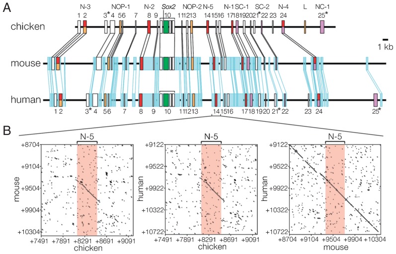 Fig. 4. Correspondence of the functionally defined Sox2 enhancers with blocks of highly conserved sequences found by comparison of chicken and mammalian Sox2 locus sequences. (A) Conserved sequence blocks found in the Sox2 locus sequences of amniotes. Blocks of sequences that show > 60% identity over the stretch of 100 base pairs are indicated by boxes. The 25 sequence blocks No. 1 to No. 25 conserved between chicken and mammalian sequences are indicated on the top. Blocks No. 3, 21 and 25 marked by asterisks are not conserved in the mouse sequence. Sequences conserved between human and mouse genomic sequences but not strongly conserved in the chicken sequence are indicated in blue. (B) Dot matrices comparing DNA sequences of the three animal sequences encompassing enhancer N-5 (conserved sequence block No. 14). A dot indicates a 10 bp sequence with > 60% matching. Between the chicken and mammalian sequences, only the enhancer sequence is significantly conserved, however between human and mouse, the enhancer sequence is embedded in a broader region of possibly non-functional sequence conservation. Adapted from Fig. 6 in Uchikawa et al. (2003). Functional analysis of chicken Sox2 enhancers highlights an array of diversity regulatory elements that are conserved in mammals. Dev. Cell 4, 509–519, with permission from Elsevier.