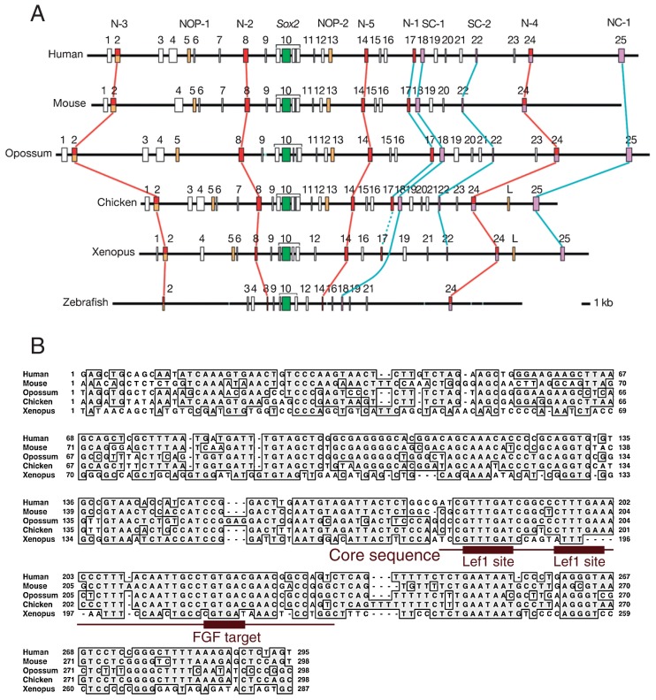 Fig. 6. Differential range of phylogenetic conservation of Sox2 enhancers. A. Comparison of highly conserved sequence blocks (boxes) and enhancers functionally assessed in higher vertebrates (colored boxes) among six animal species, human, mouse, opossum, chicken, Xenopus and zebrafish. Enhancers showing activity in the brain-forming anterior CNS are connected by red lines, while those in the posterior CNS are connected by blue lines. Most of the enhancers showing activity in the posterior CNS are conserved in amniotes, however conservation is limited in Xenopus and absent in fish. B. Alignment of enhancer N-1 sequences between five animal species. Although the entire sequence is highly conserved among amniotes, sequence conservation is limited to the core-proximal sequences in Xenopus; even in the core sequence only one Lef1 binding sequence among three essential functional elements31) is conserved in the Xenopus sequence.