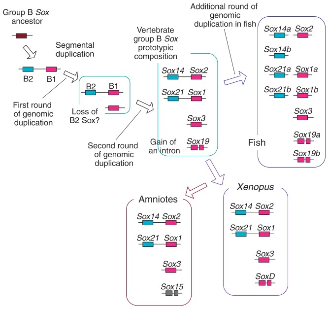 Fig. 8. Evolutionary history of genesis of group B1 Sox paralogues as a consequence of multiple rounds of genomic duplication. “Vertebrate group B Sox prototypic composition” is hypothetical. Linkages of “Sox14 and Sox2” and “Sox21 and Sox1” are conserved in human and other primates, cow and chicken, but disrupted in mouse after extensive chromosomal rearrangements (Ensembl 50, July 2008; http://www.ensembl.org/index.html).35) Linkage of “Sox21 and Sox1” is found in a broader range of vertebrate species, e.g., dog, opossum, and medaka and other fish species, although this is disrupted in zebrafish. Linkages of “Sox14 and Sox2” is reported for platypus.45) Linkages of these genes in Xenopus genome have not been confirmed.
