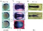 Fig. 9. Evolutionary shift of the major “pan-neural” group B1 Sox genes and of posterior coverage of the CNS by Sox2, Sox3 and Sox19 paralogues, as indicated by expression patterns in embryos at comparable developmental stages. (A) Expression pattern in zebrafish embryo of 3 somite stage. Sox19a is the most prevalent, while strong Sox2 expression is mostly confined to the anterior CNS, as in other stages (Fig. 7). Reprinted from Fig. 5B in Okuda et al. (2006). Comparative genomic and expression analysis of group B1 sox genes in zebrafish indicates their diversification during vertebrate evolution. Dev. Dyn. 235, 811–825, with permission from Wiley-Blackwell. Reported Sox3 expression pattern in medaka embryo is analogous to zebrafish.46) (B) Expression pattern in Xenopus embryos at stage 13 and later, where Sox3 is the major Sox gene expressed. Expression patterns of Sox2 and Sox3 are reproduced from Fig. 1 of Schlosser and Ahrens (2004). Molecular anatomy of placode development in Xenopus laevis. Dev. Biol. 271, 439–466, and that of SoxD is reproduced from Fig. 2 of Mizuseki et al. (1998). SoxD: an essential mediator of induction of anterior neural tissues in Xenopus embryos. Neuron 21, 77–85, with permission from the authors and Elsevier. (C) Expression pattern in chicken embryo at stage 8, where Sox2 expression is dominating. In the chicken, Sox19-paralogous gene has not been identified. Arrows indicate the shift of major group B1 Sox among the species. A and P indicate anterior and posterior, respectively.