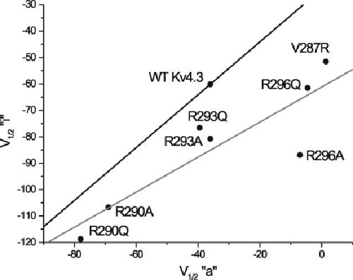 Figure 4. Summary of all Kv4.3 S4 mutant data collected to date: “i” V1/2 values as a function of “a” V1/2 values.The solid black line (centered on WT) is a linear relationship with slope = 1.0, as predicted from previous work on Shaker channels [26]. The solid gray line is a best fit to all mutant data points (WT excluded, slope = 0.65, mean R→A/Q data points from [9], [10]). All ΔV1/2 shifts were less than those predicted from Shaker. |