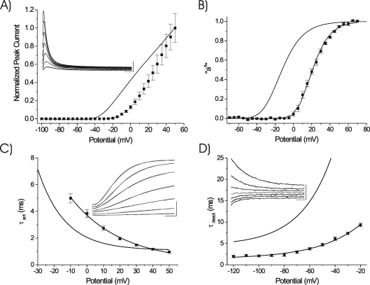 Figure 1. Activation and Deactivation Characteristics.A) Main Panel: Comparison of normalized (peak values at +50 mV) mean peak transient I–V relationships for V287R (n = 8) and WT Kv4.3, from [16]. HP = −100 mV, currents elicited by one second depolarizing pulses, and mean peak transient current defined as peak current minus residual current at the end of the depolarizing pulse. V287R mean peak current amplitude at +50 mV = 903±141 nA. Inset: Representative current waveforms for V287R elicited in response to depolarizing voltage clamp pulses applied from −10 mV to +50 mV, 10 mV increments. Calibration bar: 200 nA, 50 ms. B) Mean steady-state activation curve “a4” fit as a fourth order Boltzmann relationship (V1/2 = 1.40 mV, k = 11.62 mV, n = 11). Mean WT “a4” relationship: V1/2 = −36 mV, k = 14.50 mV, from [9]. C) Main Panel: V287R activation kinetics (n = 11). Curve fits (single exponential functions) to mean data points: τact = 4.84e10−mV/30.9+0.20 ms. Inset: Representative fits of V287R “a4” activation kinetics elicited during depolarizing pulses from −10 to +50 mV, 10 mV increments, HP = −100 mV. τact = 1.1, 1.4, 1.9, 2.5, 4.2, 5.2, 7.7 ms, −10 to +50 mV, respectively. Calibration bar: 200 nA, 1.0 ms. D) Main Panel: V287R deactivation kinetics (n = 12). Curve fits (single exponential functions) to mean data points: τdeact = 0.18emV/32.7+1.40 ms. Inset: Representative single exponential fits of V287R deactivation kinetics from −40 to −100 mV, 10 mV increments, HP = −100 mV. τdeact = 4.9, 3.9, 3.6, 2.7, 2.8, 2.2 ms, −40 to −100 mV, respectively, −70 mV not fit. Calibration bar: 50 nA, 3.0 ms. WT data in panels C) and D) from [9]. |