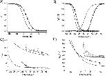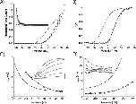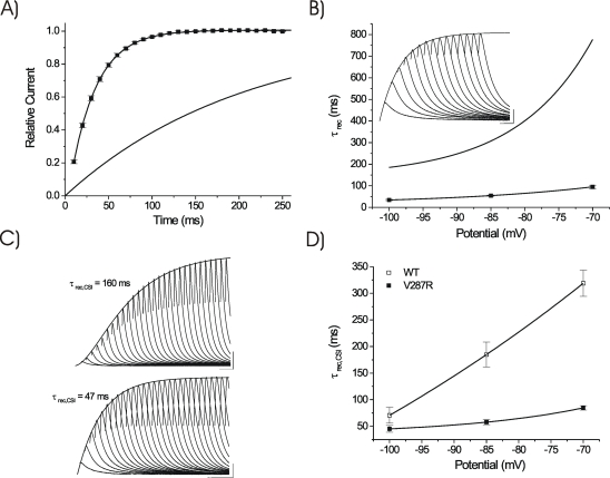 Figure 3. Recovery Characteristics.A) WT and V287R macroscopic recovery kinetics (HP = −100 mV) developed during a one second pulse to +50 mV. Mean mutant data points (n = 7) fit as a single exponential function with τrec = 30.10 ms. WT τrec = 206 ms, data from [9]. B) Main Panel: Comparison of the voltage dependence of mean τrec values of V287R and WT, from [9], [10], [16], [25]. At all HPs, macroscopic recovery kinetics were significantly faster for V287R than for WT. Curve fits: WT: τrec = 23.89emV/11.14+142.10 ms, V287R: τrec = 9.42emV/21.77+13.95 ms. Inset: Representative macroscopic recovery waveforms for V287R (P2 currents at +50 mV). Peak data points fit with a single exponential relationship with time constant = 32 ms. Calibration bar: 200 nA, 20 ms. C) Representative recordings of recovery (HP = −85 mV) from closed-state inactivation for WT (upper panel, fit as an “a2” formulation) and V287R (lower panel, exponential fit). Calibration bars: WT: 1 µA, 50 ms, V287R: 500 nA, 50 ms. D) Voltage dependence of mean τrec,csi values for WT (hollow squares, n = 5) and V287R (solid squares, n = 7). Curve fits: WT: τrec,csi = 248.50emV/93.1−582.10 ms, V287R: τrec,csi = 5.80emV/19.77+34.10 ms. |