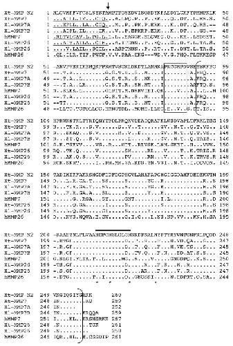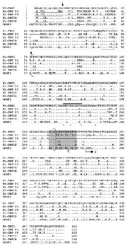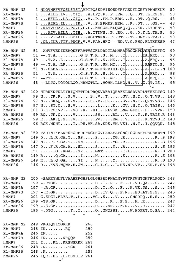 Figure 6. Comparison of MMP N2 with MMP7 and MMP26. Note that like human and Xenopus MMP7 and MMP26, MMP N2 lacks the linker peptide and hemopexin-like domain at the C-terminal. See Fig. 2 for other information.