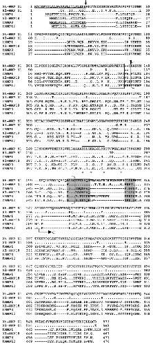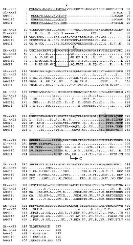 Figure 8. Comparison of Xenopus MMP N1 with human MMP1, 3, 12, and X. laevis MMP18. The amino acid sequence in shadowed letters corresponds to the region equivalent of the proline-rich sequences (16 aa) at the end of the catalytic domain in human MMP1 whose integrity is important for the collagenase specificity for collagen. A short peptide insertion (in bold letters) within this region is characteristics of stromelysins as shown here for MMP3. The Xenopus MMP N1 has a 16 aa-insertion within the same region (in bold letters) as well as some additional insertions within the C-terminal hemopexin-like domain (in italics). See Fig. 2 for other information.