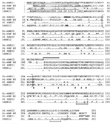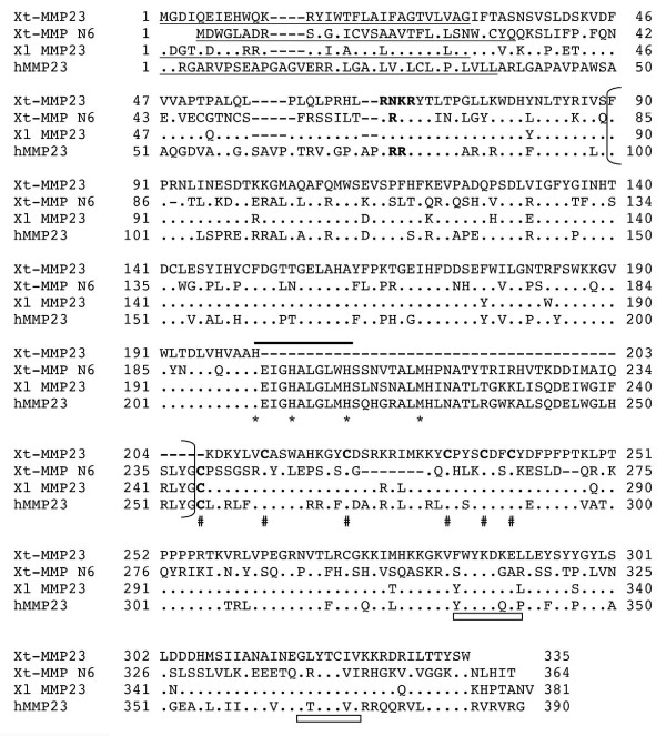 Figure 4. Comparison of frog and human MMP23 with MMP N6. The predicted signal anchor (transmembrane domain) sequences are underlined and the putative furin recognition sequences are in bold. The cysteine residues in the cysteine-array unique to MMP23 are in bold and indicated with # below. The amino acid residues characteristic of an Ig (immunoglobulin)-fold are indicated with rectangle boxes below. See Fig. 2 for other information.