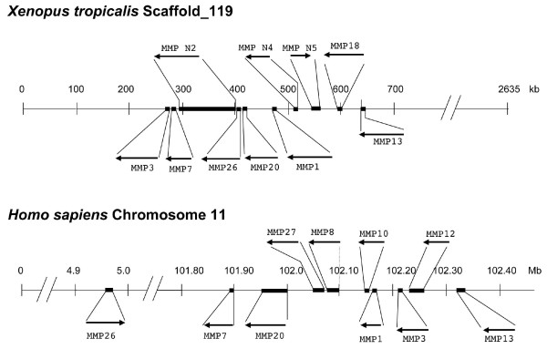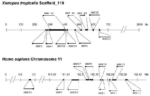Figure 9. Comparison of the MMPs cluster on X. tropicalis Scaffold_119 to that on human Chromosome 11. X. tropicalis MMP cDNA sequences were used to do BLAST search against the X. tropicalis genomic sequences to locate the genes on the assembly scaffolds. MMP 1, 3, 7, 13, 18, 20, 26, as well as the novel ones MMP N2, N4 and N5 are found on Scaffold_119. They were arranged on the scaffold according to their location and orientation. The human MMPs on Chromosome 11 were arranged according to the annotations for their locations and orientations in Human Genome Build 36.3 on the NCBI website. The MMPs shown above the line for the chromosome/scaffold are MMPs specific to X. tropicalis or human while those shown below are the MMPs present in both species. Mb, mega base pair; kb, kilo base pairs. Note the gene size was not drawn to scale for clarity.
