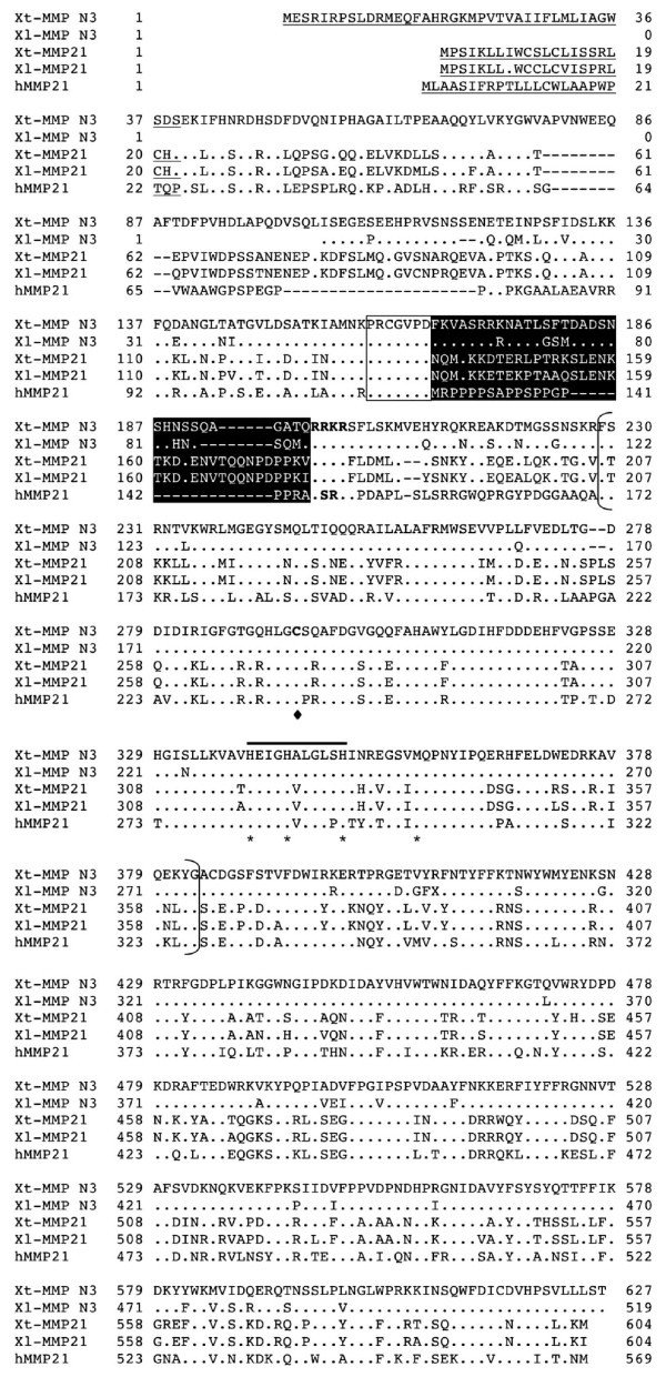 Figure 5. Comparison of MMP21 with MMP N3. The predicted signal peptide is underlined and the putative furin recognition sequences within the propeptide are in bold. The sequence in white on dark background indicates the unique insertion in the propeptide in MMP21. A unique cysteine residue in the catalytic domain is in bold and indicated with a black diamond below. Note that the sequence for Xl-MMP N3 is incomplete at the N-terminus. See Fig. 2 for other information.