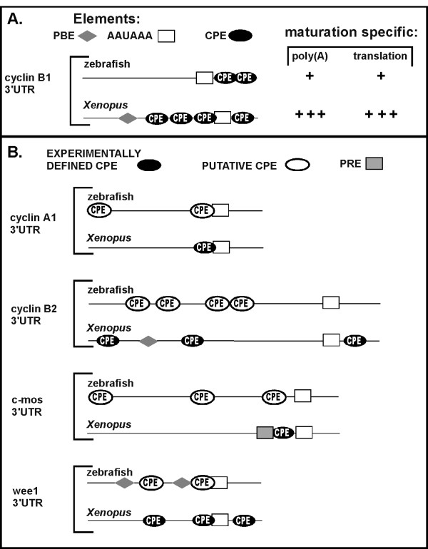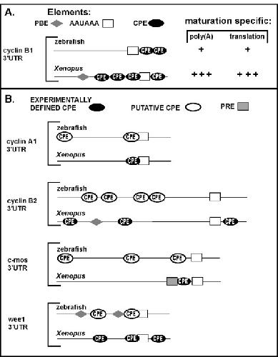 Figure 5. 3'UTR orthologs from zebrafish and Xenopus contain similar sequence elements but different architectures. (A) Schematic diagram of the zebrafish and Xenopus cyclin B1 3'UTRs depicting the RNA sequence elements that affect maturation-specific poly (A) addition and translation. The hexanucleotide sequences AAUAAA or AUUAAA, PBE: pumilio binding elements UGUA(N)AUA, CPE: cytoplasmic polyadenylation elements UUUUAU, UUUUUCAU, UUUUAAU, UUUUACU. The activity of the cyclin B1 3'UTRs in directing poly (A) addition and activating translation during oocyte maturation in both zebrafish and Xenopus (this study) are summarized on the right. (B) Schematic diagram comparing the 3'UTR architecture of zebrafish and Xenopus mRNAs. These 3'UTRs were chosen for comparison because previous studies demonstrated that the Xenopus 3'UTR in each pair is sufficient to direct poly (A) addition and activate translation during oocyte maturation. The following zebrafish mRNAs were used for analysis (listed as gene name, gene symbol, Accession number) cyclin A1, ccna1, accession BC095579; cyclin B1, ccnb1, NM_131513; b-actin2, bactin2, BC045879; cyclin B2, ccnb2, BC116569; wee1, wee1, BC116569; c-mos, mos, NM_205580, PRE – polyadenylation response element.