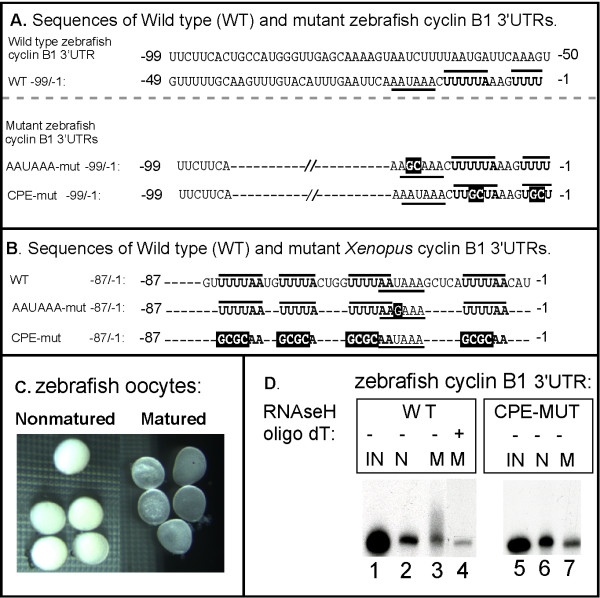 Figure 2. Polyadenylation of the zebrafish cyclin B1 mRNA 3'UTR depended upon U-rich CPE sequences. (A) Sequences of wild-type, AAUAAA mutant and U-rich mutant zebrafish cyclin B1 3'UTRs. The zebrafish cyclin B1 3'UTR is 199 nucleotides in length and the last 99 nucleotides are shown. U-rich putative CPE elements adjacent to AAUAAA are overlined and bolded while the AAUAAA sequence is underlined. Mutated sequences are white on black. Other U-rich sequences are present in the zebrafish cyclin B1 3'UTR, but their distance from AAUAAA makes it unlikely that they function as CPEs. (B) Sequences of wild-type, AAUAAA mutant and CPE mutant Xenopus cyclinB1 3'UTRs. Mutated sequences are white on black, CPE elements are overlined and bolded and AAUAAA elements are underlined. The numbers indicate positions of each nucleotide relative to the poly (A) addition site. (C) Zebrafish oocytes and matured oocytes. (D) Zebrafish cyclin B1 3'UTR is sufficient to direct polyadenylation during oocyte maturation, and the CPEs are required. P32-labeled RNA consisting of the zebrafish cyclin B1 mRNA 3'UTR was injected into 50–100 zebrafish oocytes and some oocytes were matured. RNA from injected non-mature oocytes (N) or injected matured oocytes (M) were analyzed by 4% denaturing PAGE and autoradiography. IN: Uninjected RNA. N: RNA from non-mature oocytes. M: RNA from mature oocytes. As controls, half of the total RNAs extracted from WT 3'UTR RNA injected matured oocytes were subjected to oligo dT/RNaseH treatment prior to denaturing PAGE (lane 4). The size reduction after oligo dT/RNaseH treatment indicated that the 3'UTR RNA was polyadenylated.