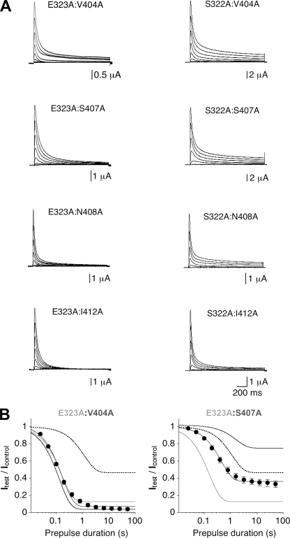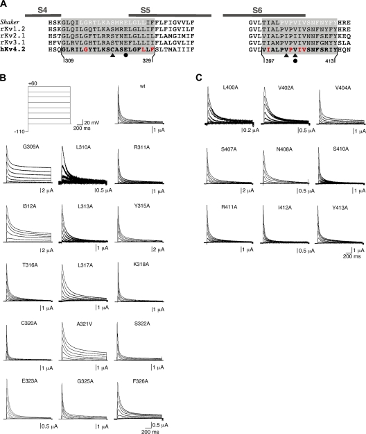 Voltage-gated potassium channels related to the Shal gene of Drosophila (Kv4 channels) mediate a subthreshold-activating current (I(SA)) that controls dendritic excitation and the backpropagation of action potentials in neurons. Kv4 channels also exhibit a prominent low voltage-induced closed-state inactivation, but the underlying molecular mechanism is poorly understood. Here, we examined a structural model in which dynamic coupling between the voltage sensors and the cytoplasmic gate underlies inactivation in Kv4.2 channels. We performed an alanine-scanning mutagenesis in the S4-S5 linker, the initial part of S5, and the distal part of S6 and functionally characterized the mutants under two-electrode voltage clamp in Xenopus oocytes. In a large fraction of the mutants (>80%) normal channel function was preserved, but the mutations influenced the likelihood of the channel to enter the closed-inactivated state. Depending on the site of mutation, low-voltage inactivation kinetics were slowed or accelerated, and the voltage dependence of steady-state inactivation was shifted positive or negative. Still, in some mutants these inactivation parameters remained unaffected. Double mutant cycle analysis based on kinetic and steady-state parameters of low-voltage inactivation revealed that residues known to be critical for voltage-dependent gate opening, including Glu 323 and Val 404, are also critical for Kv4.2 closed-state inactivation. Selective redox modulation of corresponding double-cysteine mutants supported the idea that these residues are involved in a dynamic coupling, which mediates both transient activation and closed-state inactivation in Kv4.2 channels.