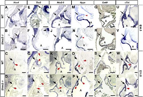 Fig. 3. Altered gene expression in the Shox2â/â heart. Expression patterns of Hcn4 (AâD), Tbx3 (EH), Nkx2-5 (IâL), Nppa (MâP), Cx40 (QâT) and cTnt (UâX) at E10.5 and at E11.5 in the wild type and Shox2â/â hearts are shown. Hcn4 is expressed in the dorsal right wall of the right atrium in the wild type (A, C) and is reduced or absent in the Shox2 mutant (B, D). Tbx3 is expressed in the dorsal right wall of the right atrium and in the sinus valves (E, G), however is absent in the Shox2 mutant (F, H) at both stages. Nppa, Cx40, and Nkx2-5 are ectopically expressed in the dorsal right wall of the Shox2â/â right atrium at both stages (J, N, R, L, P, T), as compared to the wild type controls (I, M, Q, K, O, S). cTnt shows comparable expression level in the Shox2â/â heart (V, X) and the wild type controls (U, W). In all panels, the arrows point to the SAN region, while the arrowheads point to the sinus valves. A, atrium. Scale bars represent 50 μm.