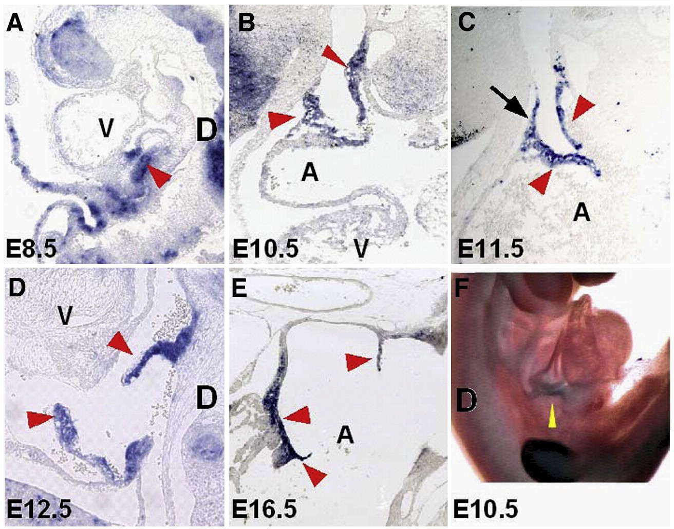 Fig. 1. Shox2 expression in the murine developing heart. (A) Shox2 expression is initially detected in the sinus venosus region (arrowhead) at E8.5 embryo. At E10.5 (B) and E11.5 (C), Shox2 expression gradually becomes restricted to the right side of the heart to the dorsal wall of the right atrium, the SAN region (arrow, C) and sinus valves (arrowheads, B, C). At E12.5 (D), restricted Shox2 expression in the SAN and sinus valves (arrowheads) is clearly observed. (E) Shox2 expression at E16.5 follows the same pattern as previous stages. (F) Whole mount in situ hybridization showing the expression of Shox2a isoform in the sinus venosus region (yellow arrowhead). A, atrium; V, ventricle; D, dorsal side.