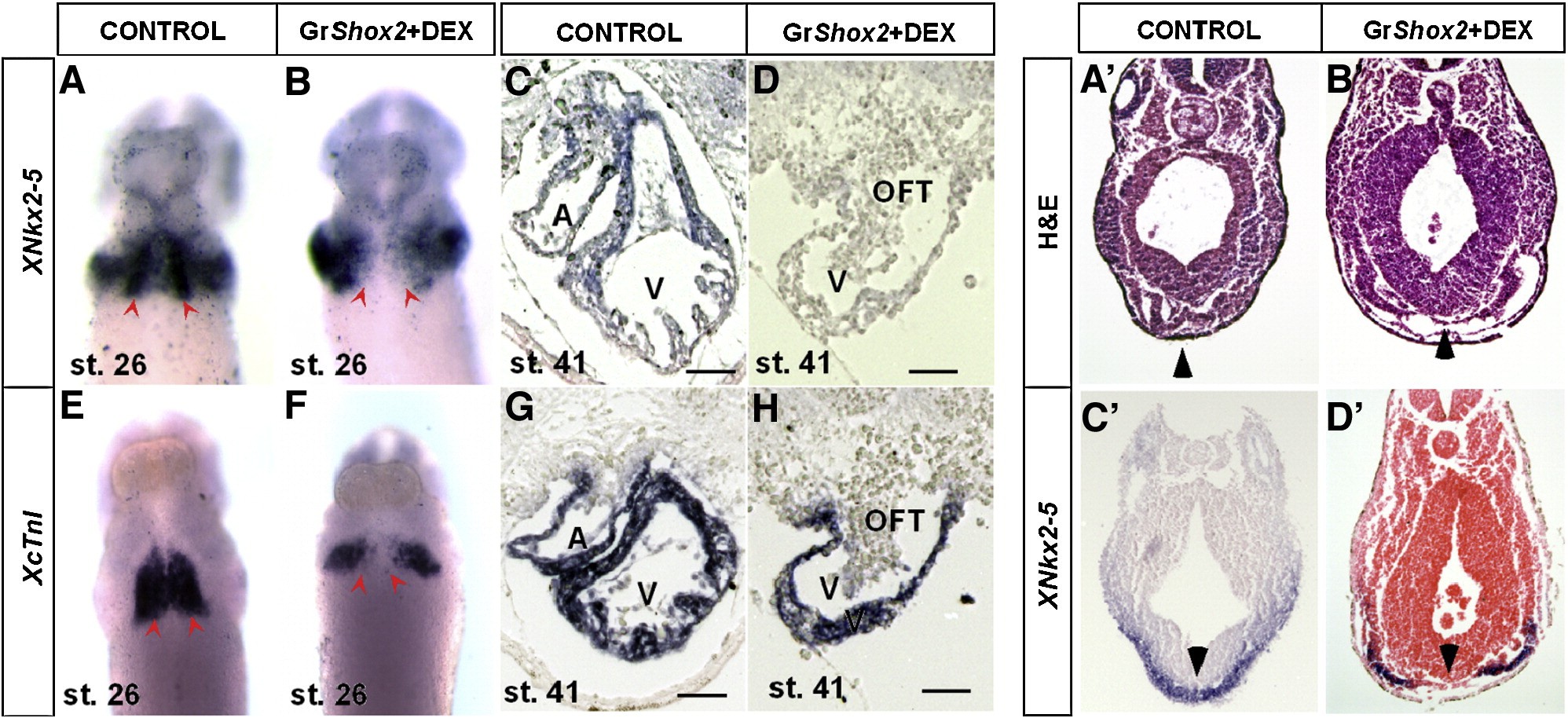 Fig. 4. Shox2 overexpression downregulates Nkx2-5 expression. XNkx2-5 and XcTnI expression was analyzed by in situ hybridization in control embryos at stage 26 (A, E) and at stage 41 (C, G) and in GR-Shox2 mRNA injected induced embryos at same stages (B, F, D, H). XNkx2-5 expression is clearly reduced at the midline of injected induced embryos at stage 26 (B), as compared to control embryos (A). XcTnI expression is maintained in injected induced embryos laterally, but is absent at the midline at stage 26 (F), as compared to the controls (E). At stage 41, XNkx2-5 expression is absent in injected induced embryos (D) compared to control embryos (C). XcTnI expression in injected induced embryos (D) is comparable to that of control embryos (H). Altered gene expression is accompanied by the abnormal heart morphology when comparing control and injected induced embryos (C, D, G, H). Histological transverse sections of Xenopus embryos showing loss of mesodermal cardiac progenitor cells in the ventral midline in injected induced embryos (Bâ, Dâ, arrowheads), as evidenced by the loss of XNkx2-5 expression in the corresponding region when compared to control embryos (Aâ, Câ, arrowheads). Scale bars represent 50 μm.