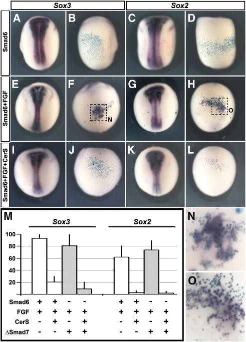 Fig. 3. BMP inhibition together with eFGF activation induces neural marker expression indirectly in Xenopus. (AâL) Inhibition of BMP by injection of Smad6 into the A4 blastomere does not induce either Sox3 (A, B) or Sox2 (C, D) expression. eFGF together with BMP inhibition into the A4 blastomere induces Sox3 (E, F, N) and Sox2 (G, H, O). Neural induction by the former combination is inhibited when Nodal signaling is blocked: injection of Smad6 + eFGF together with CerS no longer induces Sox3 (I, J) or Sox2 (K, L). (M) Quantification of Sox3 and Sox2 expression in the different experiments described above. A, C, E, G, I and K dorsal views. B, D, F, H, J and L ventral views of the embryos to their left. N and O are enlargements of the areas enclosed by a square in F and H, respectively.