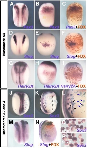 Fig. 5. Only the border of the neural plate is sensitive to BMP inhibition in Xenopus. (AâI) Smad6 (1 ng) injection into the A4 blastomere induces Pax3 (AâC), Slug (DâF) and Hairy2A (GâI). (A, D, and G: dorsal view; B, C, E, F, H and I: ventral view of the embryo to their left). (JâN) Injection into blastomere A2/3 expands Sox3 (JâL) and Slug (M, N). J, M: dorsal view; K, L and N are lateral views of the embryos to their left. White brackets in J show the extension of the neural plate in the injected and non-injected sides of the embryo. The black square in K indicates the area enlarged in L. Black arrows in L point to injected cells adjacent to the endogenous neural plate, expressing Sox3; the blue arrows point to injected cells distant from the endogenous neural plate, which do not express Sox3. Injected cells were recognized by FDX or LacZ (C, F, I, K, L and N, for embryos to their left). (OâP) Animal caps from Smad6-injected embryos at the 2-cell stage express Sox3 (O), which is not inhibited by CerS (P).