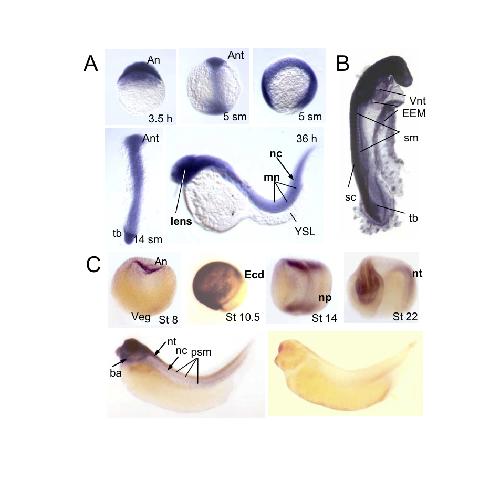 Fig. S3. Kaiso is a ubiquitously expressed methyl-dependent transcriptional repressor. Kaiso whole-mount RNA in situ hybridization on zebrafish (A), chicken (B) and Xenopus (C) embryos. The stages of development for Xenopus and hours after fertilisation for zebrafish embryos are indicated. An, animal pole; Veg, vegetal pole; Ant, anterial part of the embryo; Ecd, ectoderm; np, neural plate; nc, notochord; nt, neural tube; sc, spinal cord; tb, tailbud; mn, motoneurons; psm, perisomitic mesoderm; ba, branchial arches; sm, somites; YE, yolk extension layer; EEM, extraembryonic membranes; Vnt, ventral neural tube.