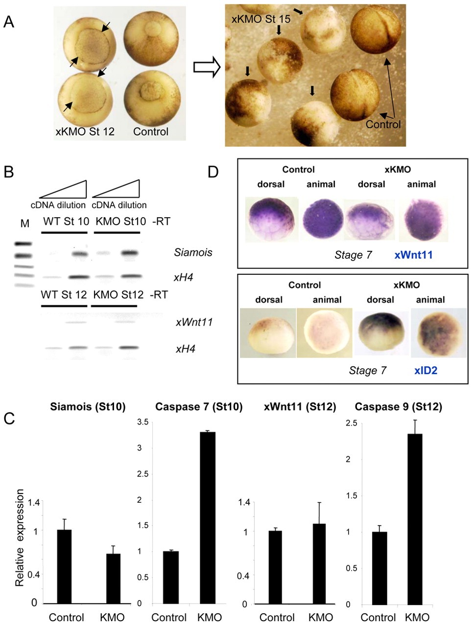 Fig. 7. The Wnt signalling pathway is not activated in xKMO morphants. (A) The xKMO morphants exhibit a delay in closing the blastopore (short arrows) compared with wild-type embryos. This phenotype appears in 85-90% of the embryos and is identical to that presented by McCrea and colleagues (Kim et al., 2004; Park et al., 2005). By stage 15 (neurulation), the xKMO morphants (downward arrow) cannot form a neural fold; they are apoptotic and are shedding cells through the open blastopore. Control embryos are shown with a proper neural fold (long arrows). (B,C) Neither Siamois nor xWnt11 are ectopically activated in xKMO morphants when assayed by semi-quantitative RT-PCR according to Park et al. (Park et al., 2005) or real-time PCR relative to a histone H4 control at stage 10 (Siamois) or 12 (xWnt11). Caspase7 and Caspase9 expression is activated in 2.5-3.5 times compared to control in the same sets of KMO embryos at stages 10 and 12, respectively. (D) Whole-mount RNA in situ analysis demonstrates that xWnt11 is not prematurely activated in pre-MBT xKMO morphants in comparison to a control transcript, xID2, that is activated prematurely (Ruzov et al., 2004).