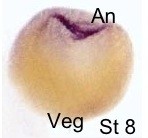 zbtb33 (zinc finger and BTB domain containing 33)gene expression in Xenopus laevis embryo via in situ hybridization, NF stage 8, lateral view, dorsal up.