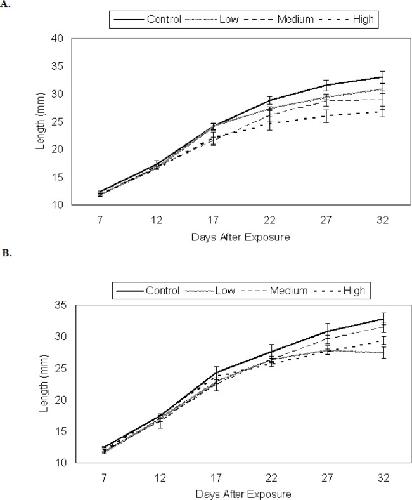 Figure 1. Larval growth of P. triseriata among control and 48 h TCDD treatments expressed as an increase in, a) total length (mm) and, b) weight (g) over time. Each data point represents the average length (± SE) of ten randomly selected larvae. Eggs were originally exposed for 48 h to waterborne concentrations of TCDD as follows: low (0.3 μg/l), medium (3.0 μg/l), and high (30.0 μg/l). Control P. triseriata were statistically longer, but not heavier than TCDD-treated larvae on the final sampling day (day 40)