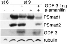 Fig. 2. Direct effects of GDF3 over-expression in frog embryos. GDF3 was injected with and without α-amanitin, which blocks protein translation. Embryos were harvested at stage 9 and analyzed for activation of BMP and Nodal signaling (Psmad1 and Psmad2, respectively). Stage 6 embryos are shown as a negative control for TGF-β activation, tubulin is shown as a loading control.