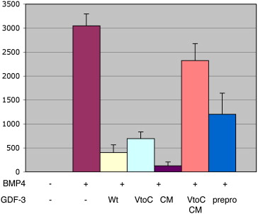 Fig. 4. The prepro form and domain of GDF3 can inhibit BMP signaling. Luciferase assay using a BMP-responsive element (BRE) driving expression of a luciferase reporter (BRE-Lux). Embryos were injected with BMP4 RNA (100Â pg/embryo) alone or with 1Â ng of GDF3 constructs for wild-type GDF3 (Wt), a cleavage mutant of GDF3 (CM), or the prepro domain of GDF3 (prepro). Reporter alone is shown as a baseline control.
