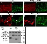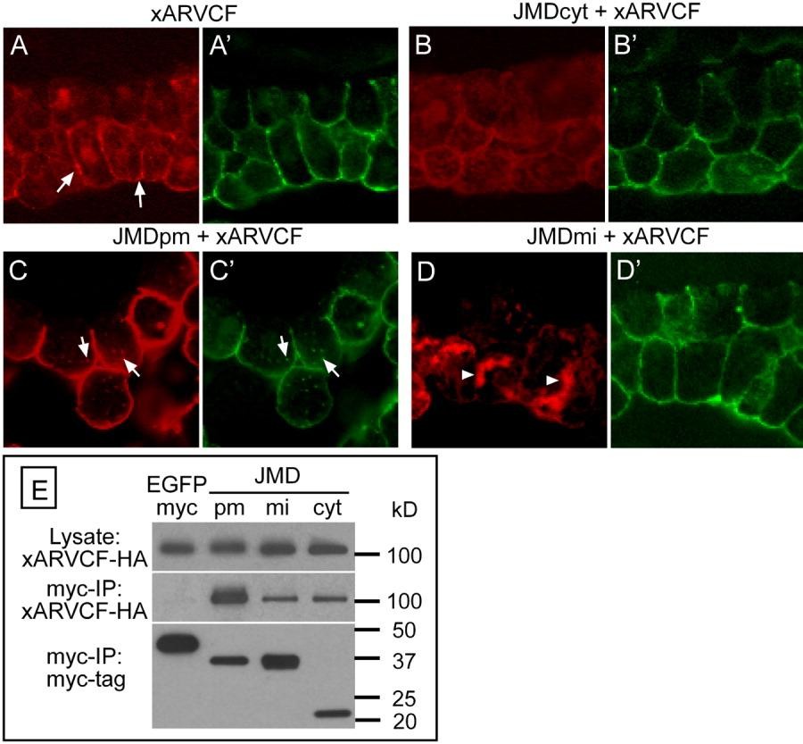 Figure 4. Coexpression of JMD constructs changes intracellular distribution of xARVCF. Animal cap of injected embryos (all JMD constructs 1 ng/inj., xARVCF 250 pg/inj.), stage 10.5. Bar = 20 mu m. A-D: xARVCF-HA staining. A'-D': C-cadherin staining. A: xARVCF localizes to nucleus, cytoplasm, and plasma membrane. Arrows: Patches of stronger plasma membrane staining. B: JMDcyt+xARVCF, xARVCF locates mainly to cytoplasm and nuclei, plasma membrane staining appears partially reduced. C: JMDpm+xARVCF, xARVCF localizes to the plasma membrane and to intracellular spots (arrows). C': Cadherin staining shows cytoplasmic spots that colocalize with xARVCF spots (compare arrows). A', B', D': Cadherin staining is restricted to the plasma membrane, no defined cytoplasmic spots are detectable. D: JMDmi+xARVCF, xARVCF localizes to large cytoplasmic patches (arrowheads). E: Co-immunoprecipitation of xARVCF. Embryos were co-injected with mRNAs encoding HA-tagged xARVCF and myc-tagged JMD constructs or a myc-tagged EGFP construct as control. Embryos were extracted at early gastrula stage and the JMD-constructs were immunoprecipitated with an antibody against the myc-tag. Loaded lysate corresponds to the equivalent of 1/4 embryo, loaded myc-IP to the equivalent of 9 embryos. Co-precipitating xARVCF was detected with a HA-tag antibody. xARVCF co-precipitates with the JMD constructs, but not with EGFPmyc. Note that JMDpm appears to bind xARVCF more efficiently than JMDmi and JMDcyt.