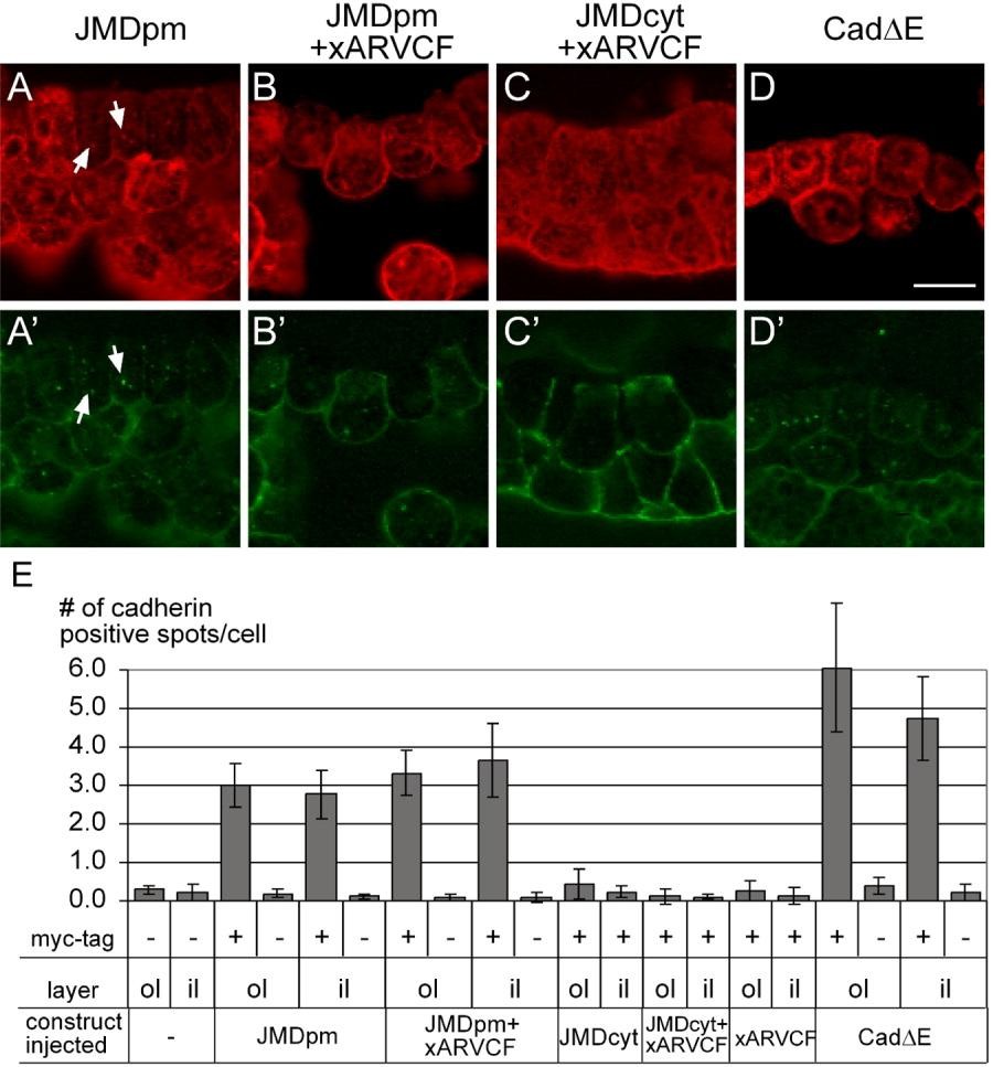 Figure 5. JMDpm expression leads to the formation of cadherin-positive intracellular spots. Animal cap of injected embryos at early gastrula, stage 10.5 (JMDpm, JMDcyt 1 ng/inj.; Cad Delta E, xARVCF 250 pg/inj.). Bar = 20 mu m. A-D: staining of myc tagged constructs. A'-D': C-cadherin staining. A: JMDpm, construct localizes to the plasma membrane and intracellular structures. In some cells, isolated myc-positive spots can be distinguished (arrows). A': Cadherin-positive spots appear in the cytoplasm (arrows), showing the same distribution as myc-positive spots. B: JMDpm+xARVCF, JMDpm shows similar intracellular distribution as in A. B': Cadherin-positive spots in the cytoplasm. C: JMDcyt+xARVCF, JMDcyt is cytoplasmic and nuclear. C': no cytoplasmic cadherin spots are visible. D: Cad Delta E localizes to plasma membrane and intracellular structures. D': Cadherin-positive spots appear in the cytoplasm. E: Quantification of intracellular cadherin spots. The number of cadherin-positive spots in the cytoplasm was determined per myc-positive cell. Cells of the outer layer (ol) and cells of the inner layer (il) were evaluated separately. If construct expression resulted in an increase of cadherin spots, spots in adjacent myc-negative cells were also counted. Error-bars indicate standard deviation.
