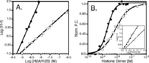 squares are major type histone dimer. Inset of B is the