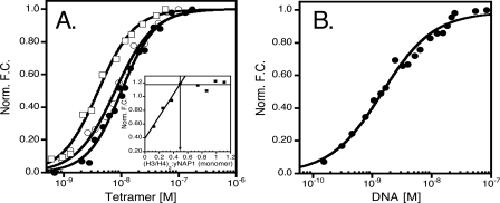 tetramer) (open squares). Inset of A is the