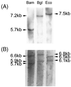 Southern blot analysis of the IBSP genes. Genomic DNA was digested with BamHI (Bam), BglII (Bgl), and EcoRV (Eco) restriction enzymes, then hybridized with the IBSP cDNA probe. (A) Caiman IBSP gene; genomic DNA derived from a spectacled caiman (Caiman crocodilus apaporiensis), which is a near relation of Paleosuchus palpebrosus, was used. (B) Toad IBSP genes.
