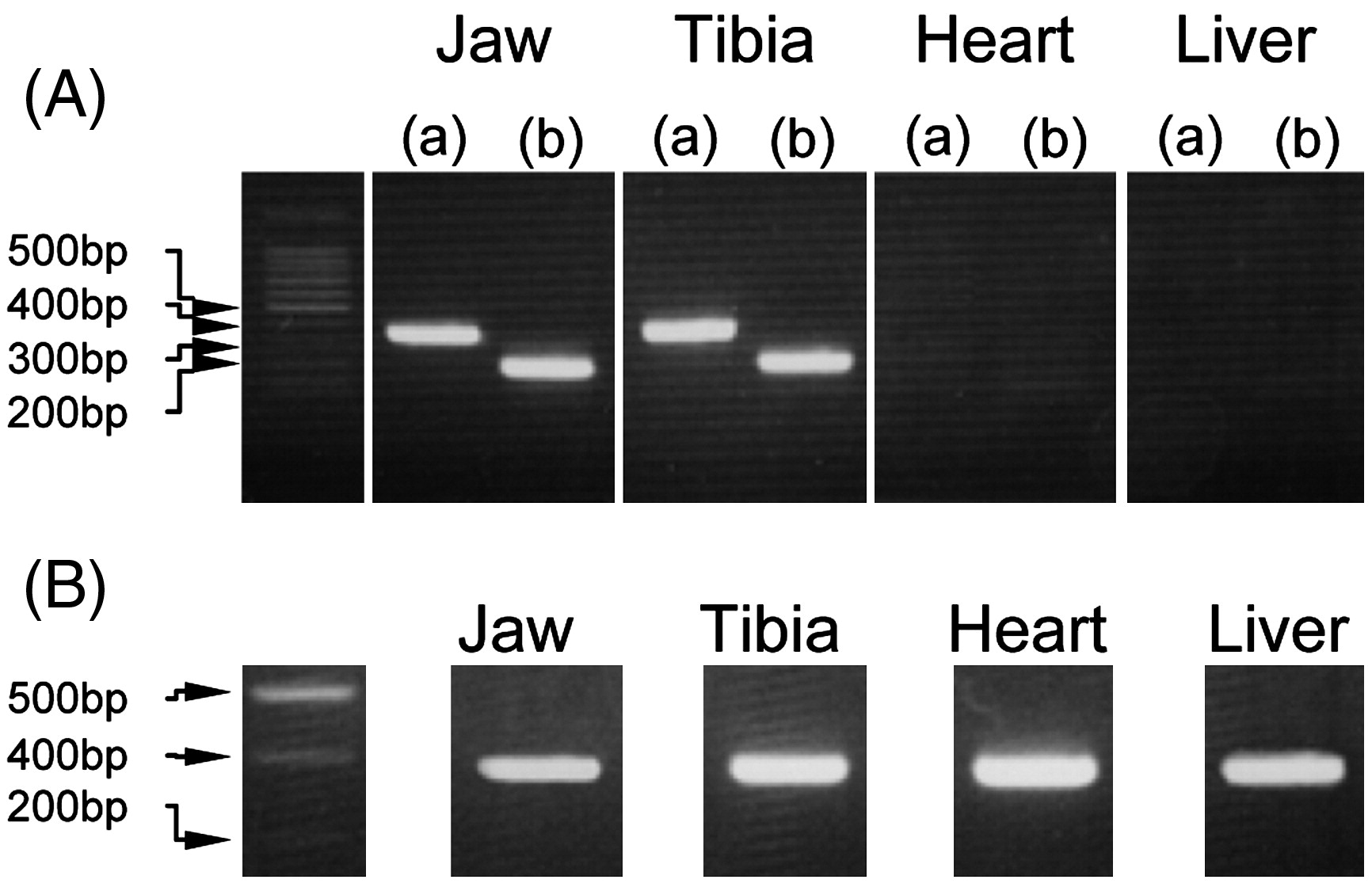 RT-PCR analysis of toad tissues. (A) cDNA was amplified from jaw, tibia, heart, and liver specimens using the IBSP cDNA-specific primer sets IBSPX17 and IBSPX14 for toad-A (Lane a), and IBSPX22 and IBSPX28 for toad-B (lane b). (B) cDNA was amplified with primers GAPDH1 and GAPDH2, and used as a positive control.