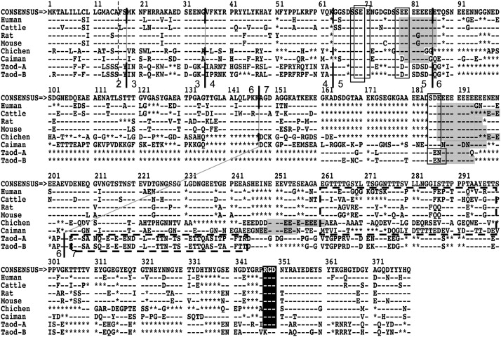 Amino acid sequence alignment of IBSP genes from human, bovine, rat, mouse, chicken, caiman, and toad specimens. Amino acid residues are shown with the IUPAC-IUB single letter code. Identity with the simple majority consensus sequence at the top is indicated by a dash (-) and deletions introduced for optimal alignment by asterisks (⁎). Vertical lines indicate exon borders of the human, chicken, and toad IBSP genes, and numbers on both sides of the line denote exon numbers. Dotted vertical line shows the cleavage site for eliminating signal peptides. The poly-Es are surrounded by grizzled boxes. The conserved signature for the phosphoserine motifs and the Thr-rich regions are indicated by open boxes with solid lines and dotted lines, respectively. The white letters on shaded backgrounds represent the conserved RGD sequences.