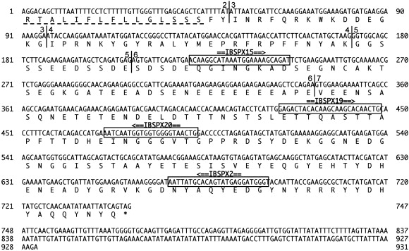 Nucleotide and translated amino acid sequences of caiman IBSP cDNA clone. Amino acid residues are shown with the IUPAC-IUB single letter code. The signal peptide is underlined with a dotted line. The stop codon is indicated by an asterisk (⁎) and polyadenylation signals are underlined with a solid line. Primer positions and orientations are indicated by double lines with arrowheads above their boxed locations in the sequence. The sequences can be accessed in the GenBank database under accession No. EU007686.