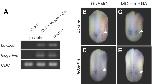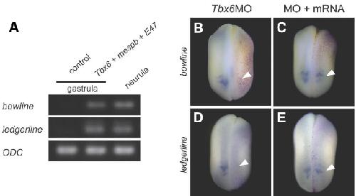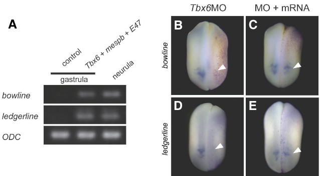 Fig. 2. Tbx6 is required for bowline and ledgerline expression during Xenopus development. (A) The ex- pression of bowline and ledgerline is induced by the synergistic effects of Tbx6, mespb, and E47. RT-PCR analysis shows that overexpression of the mixture of Tbx6, mespb, and E47 mRNA species induces ectopic bowline and ledgerline expression in gastrula-stage Xeno- pus embryos. ODC (ornithine decarboxylase) was used as an internal control. (B-E) Expression of bowline mRNA and ledgerline mRNA in Xtbx6 exint-MO-injected embryos. All the embryos were fixed at stage 19 for whole-mount in situ hybridization to detect the expression of bowline (B,C) and ledgerline (D,E). Magenta-Gal staining indicates the injected side. (B,D) A representative embryo injected with 50 ng Xtbx6 exint-MO. Inhibition of the splicing of Tbx6 mRNA results in loss of expression of bowline and ledgerline. The white arrowheads in (B) and (D) indicate reduced bowline and ledgerline expression, respectively. (C,E) Representative embryos injected with 50 ng Xtbx6 exint-MO and 2 pg or 10 pg Xenopus Tbx6 mRNA, respectively. The white arrowheads in (C,E) indicate rescued bowline and ledgerline expression, respectively.