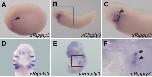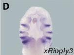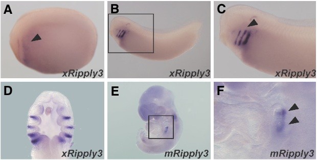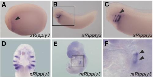 Fig. 6. Expression profile of Ripply3 during X. laevis and mouse development. (A-C) Whole-mount in situ hybridization for xRipply3. (A) At the late neurula stage, xRipply3 is expressed in the region near the heartmesoderm. (B) At the tailbud stage, xRipply3 expression is restricted to the pharyngeal region. Panel (C) is a magnified view of (B). Lateral views are shown with the anterior towards the left. The arrowheads in (A) and (C) indicate xRipply3 expression. (D) Tailbud-stage embryos stained with the xRipply3 probe were sliced frontally. (E,F) Whole-mount in situ hybridization for murine Ripply3. (E) Murine Ripply3 expres- sion is observed in the pharyngeal region. Panel (F) is a magni- fied view of (E). The arrowheads in (F) indicate murine Ripply3 expression.