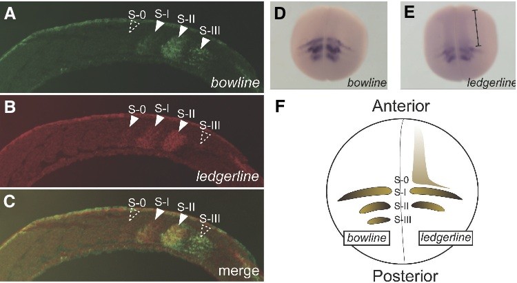 Fig. 1. Differential expression patterns of the bowline and ledgerline genes during Xenopus somitogenesis. (A,B) Expression patterns of bowline and ledgerline in the Xenopus PSM. Longitudi- nal serial sections of a stage 20 embryo were stained for bowline (A) and ledgerline (B), and the results are shown as a pseudocolor display. The white arrowheads in (A) and (B) represent the regions in which bowline and ledgerline, respectively, areexpressed. (C)Mergedimageof(A,B). The white arrowheads in (C) represent the regions in which the expression patterns of bowline and ledgerline overlap. The sec- tions are orientated so that the anterior part is to the left. (D,E) Whole-mount in situ hybridization for bowline (D) and ledgerline (E). The expression of bowline is restricted to the somitomeres. Interest- ingly, ledgerline is expressed in the newly formed somites, as well as in the somitomeres. The black bar indicates ledgerline expression in the newly formed somites. (F) Schematic diagram of the bowline and ledgerline expression patterns. Bowline is expressed in the anterior halves of the S-I to S-III somitomeres (left side). Ledgerline is expressed in the newly formed somites, in addition to the anterior halves of the S-0 to S-II somitomeres (right side). The dorsal view is shown, with