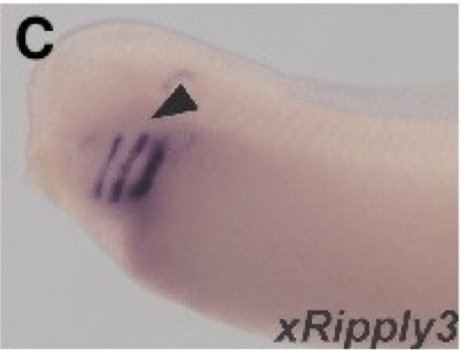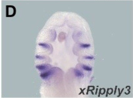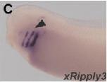 ripply3 (ripply transcriptional repressor 3) gene expression in Xenopus laevis embryo via in situ hybridization, NF stage 33 and 34, lateral view, anteriorleft.