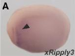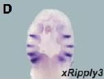 ripply3 (ripply transcriptional repressor 3) gene expression in Xenopus laevis embryo via in situ hybridization, NF stage 20, lateral view, anteriorleft.