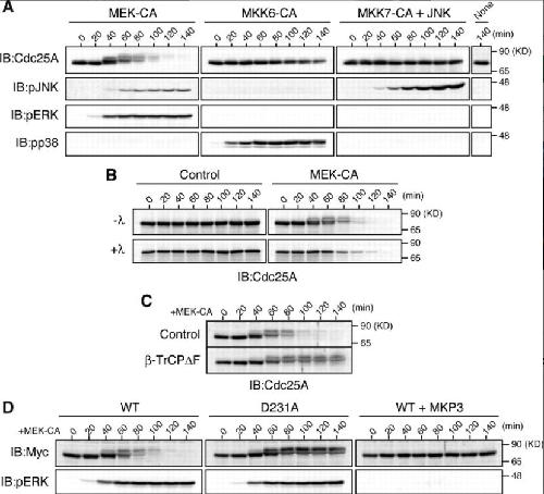 Figure 1. Induction of SCFβ-TrCP-dependent degradation of Xe-Cdc25A by the ERK pathway. (A) Artificially activated eggs (or eggs after 40 min of calcium ionophore treatment) were injected or not with 9 ng of JNK mRNA, reinjected 2.5 h later (time 0) with 9 ng of either MEK-CA, MKK6-CA, or MKK7-CA mRNAs, and analyzed at 20-min intervals by immunoblotting (IB) with anti-Xe-Cdc25A, anti-phospho-JNK, anti-phospho-ERK, and anti-phospho-p38 antibodies. (B) Activated eggs were injected with 9 ng of GST mRNA (Control) or MEK-CA mRNA. Egg extracts were then treated (+λ) or not (âλ) with λ phosphatase and analyzed for Xe-Cdc25A by immunoblotting. (C) Activated eggs were injected with 18 ng of GST mRNA (Control) or dominant-negative β-TrCPÎF mRNA, reinjected 2.5 h later with 9 ng of MEK-CA mRNA, and then analyzed for Xe-Cdc25A by immunoblotting. (D) Activated eggs were injected or not with 9 ng of MKP3 mRNA, reinjected 40 min later with 2 ng of mRNA encoding Myc-tagged WT or D231A Xe-Cdc25A, further injected 2.5 h later with 9 ng of MEK-CA mRNA, and then analyzed for Myc-Xe-Cdc25A constructs and phospho-ERK by immunoblotting. Five, three, four, and four independent experiments were performed for A, B, C, and D, respectively, and, for each, a typical result is shown.