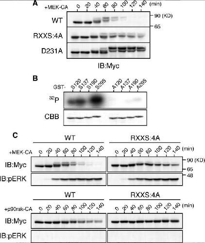 Figure 2. p90rsk phosphorylation, and its requirement for the ERK pathway-induced degradation, of Xe-Cdc25A. (A) Activated eggs were injected with 2 ng of mRNA encoding the indicated Myc-Xe-Cdc25A constructs, reinjected 2.5 h later with 9 ng of MEK-CA mRNA, and then analyzed for Myc-Xe-Cdc25A constructs by immunoblotting. (B) GST-fused Xe-Cdc25A peptides (GST-S120, GST-A120, etc., each named after the relevant Ser or substituted Ala residue numbers) were incubated with [γ-32P]ATP and p90rsk protein, subjected to SDS-polyacrylamide gel electrophoresis, stained with Coomassie Brilliant Blue (CBB), and then autoradiographed (32P). (C) Activated eggs were injected with 2 ng of mRNA encoding the indicated Myc-Xe-Cdc25A constructs, reinjected 2.5 h later with either 9 ng of MEK-CA mRNA or 36 ng of p90rsk-CA mRNA, and analyzed for Myc-Xe-Cdc25A constructs and phospho-ERK by immunoblotting. Four, three, and four independent experiments were performed for A, B, and C, respectively, and, for each, a typical result is shown.