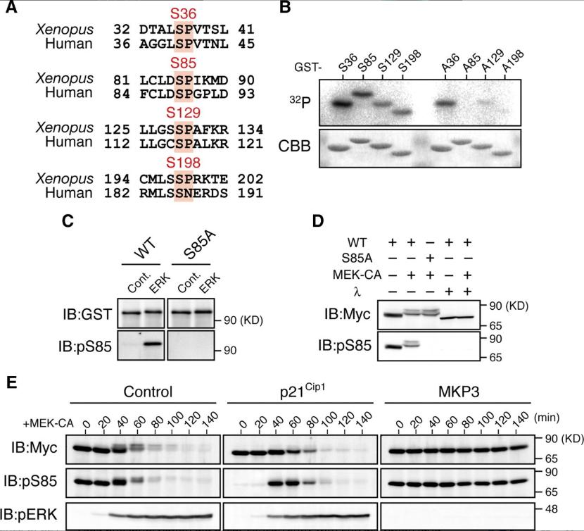 Figure 3. Phosphorylation of Xe-Cdc25A by ERK. (A) Conservation of consensus ERK phosphorylation motifs (Ser-Pro) in Xenopus and human Cdc25A proteins. (B) The indicated GST-fused Xe-Cdc25A peptides were incubated with [γ-32P]ATP and ERK protein and analyzed as described in Figure 2B. (C) GST-tagged full-length Xe-Cdc25A proteins (WT or S85A) were synthesized in wheat germ extracts, purified by GST-pull-down, incubated with either buffer (Cont.) or ERK protein, and analyzed by immunoblotting with anti-GST and anti-phospho-S85 antibodies. (D) Activated eggs were injected with 2 ng of mRNA encoding Myc-Xe-Cdc25A (WT or S85A), reinjected or not 2.5 h later with 9 ng of MEK-CA mRNA, and cultured for 50 min. Egg extracts were treated or not with λ-phosphatase and analyzed for Myc-Xe-Cdc25A and phospho-S85 by immunoblotting. (E) Activated eggs were injected with either buffer (Control), 18 ng of p21Cip1 mRNA, or 9 ng of MKP3 mRNA, reinjected 40 min later with 2 ng of Myc-Xe-Cdc25A mRNA, further injected 2.5 h later with 9 ng of MEK-CA mRNA, collected at the indicated times, and analyzed by immunoblotting as described in D. Four, three, four, and five independent experiments were performed for B, C, D, and E, respectively, and, for each, a typical result is shown.